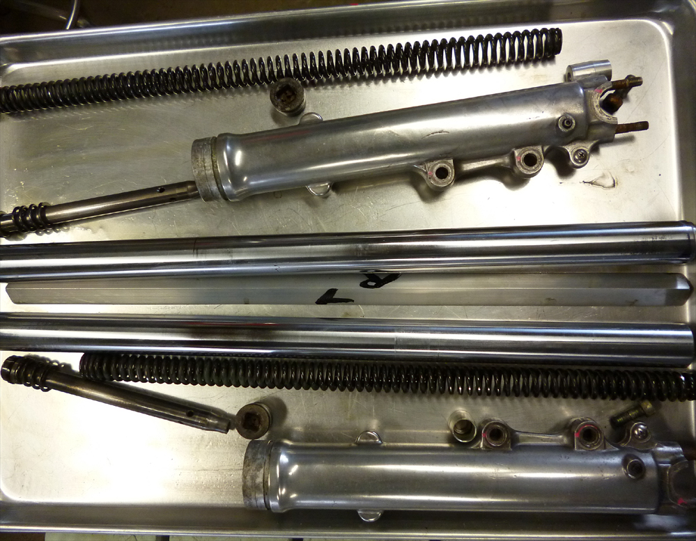 ステムベアリングの注油調整後、フォークのOHへ移行。