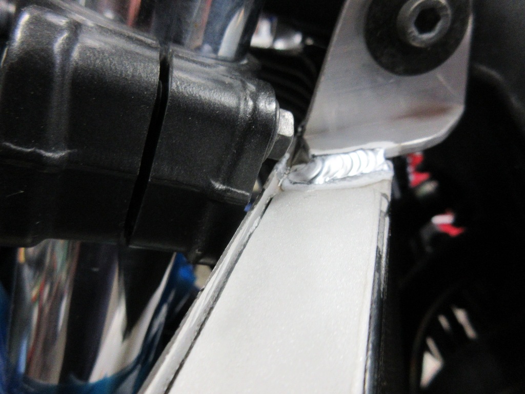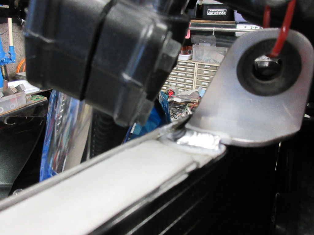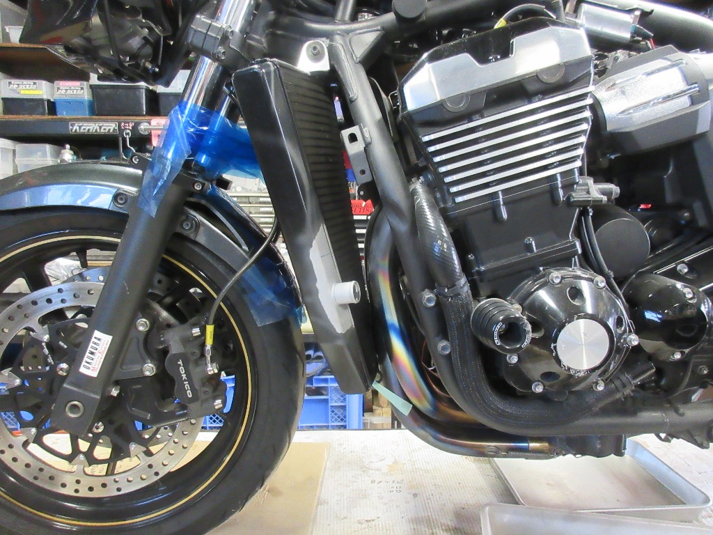 冷却ファンがエキパイに干渉する為、前方へ追いやられる。