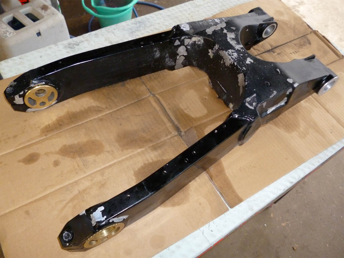 外したスイングアームは、洗浄液にドブ漬け洗浄して加工準備。