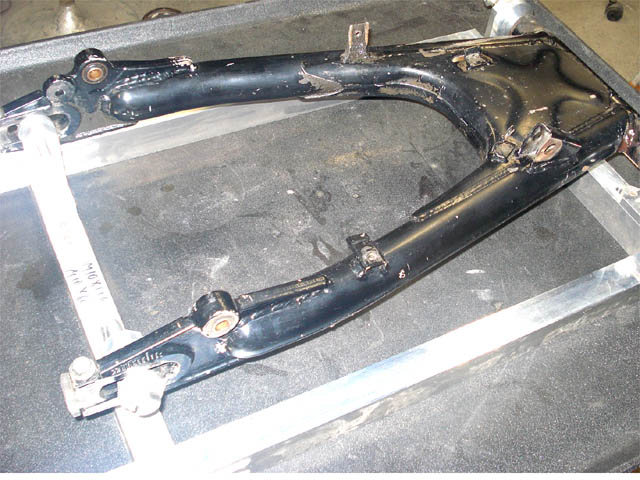 純正のスイングアームを治具上で計測します。
