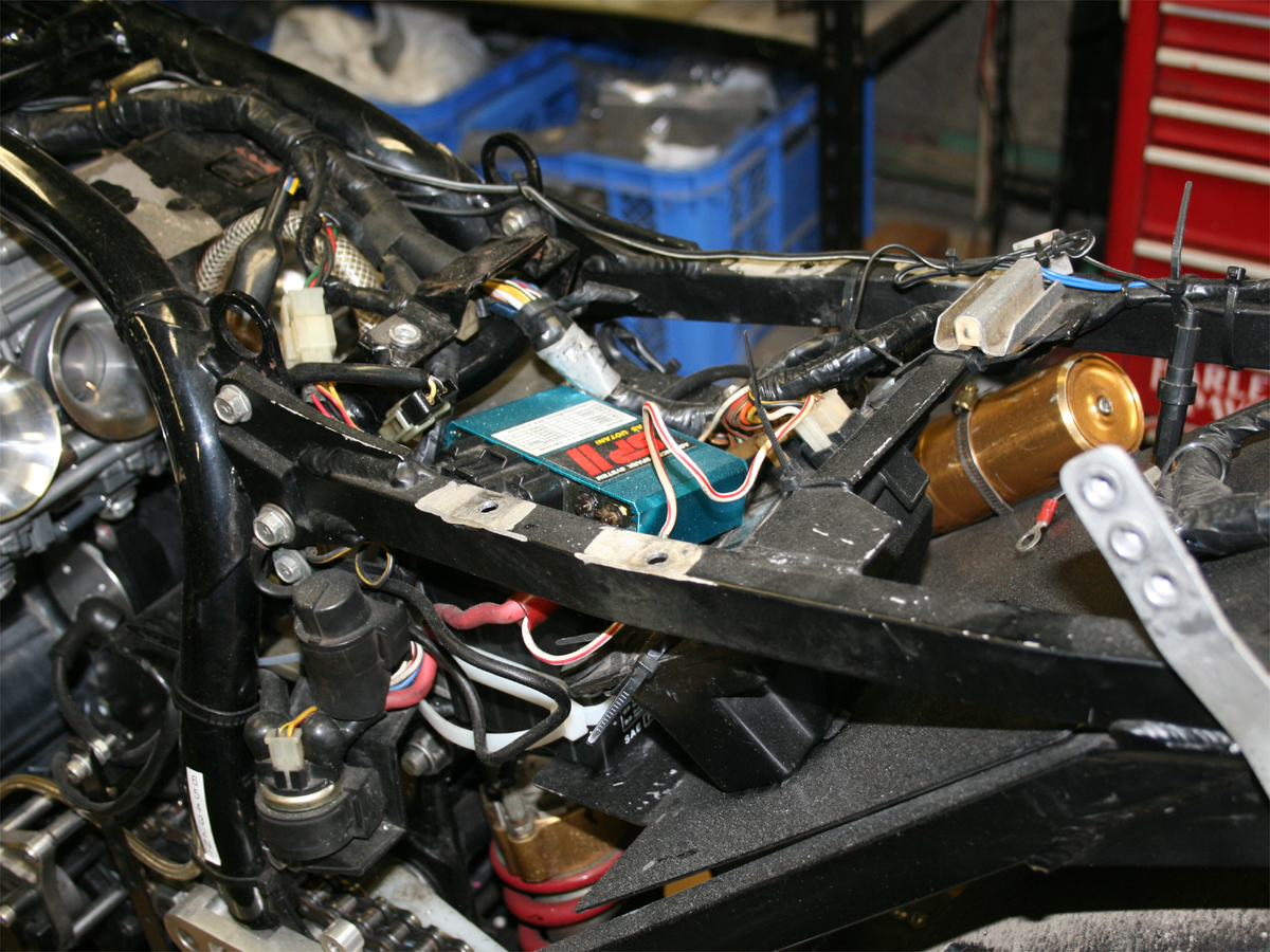 シート下は新設したバッテリーケースにリレー類を隣接させるレイアウト。