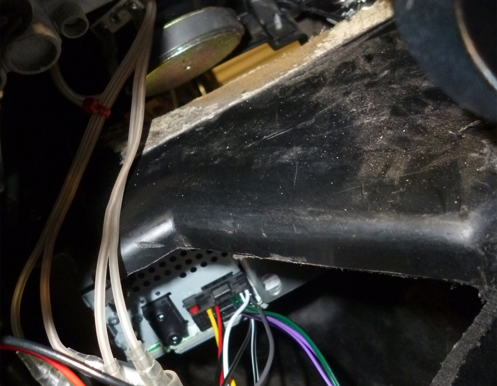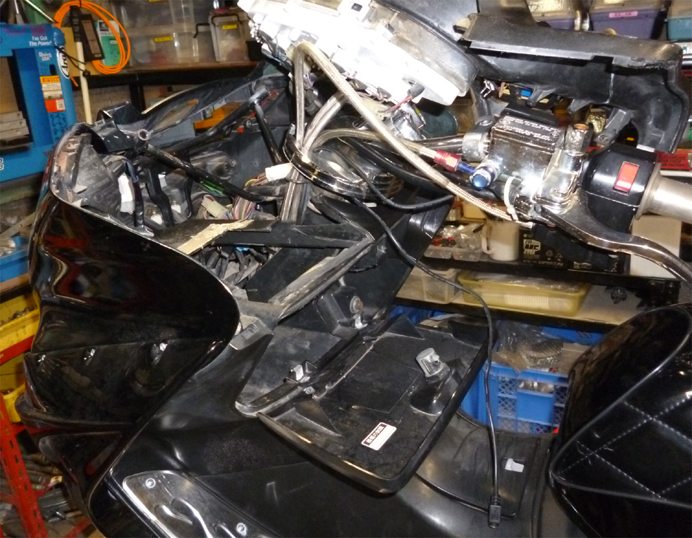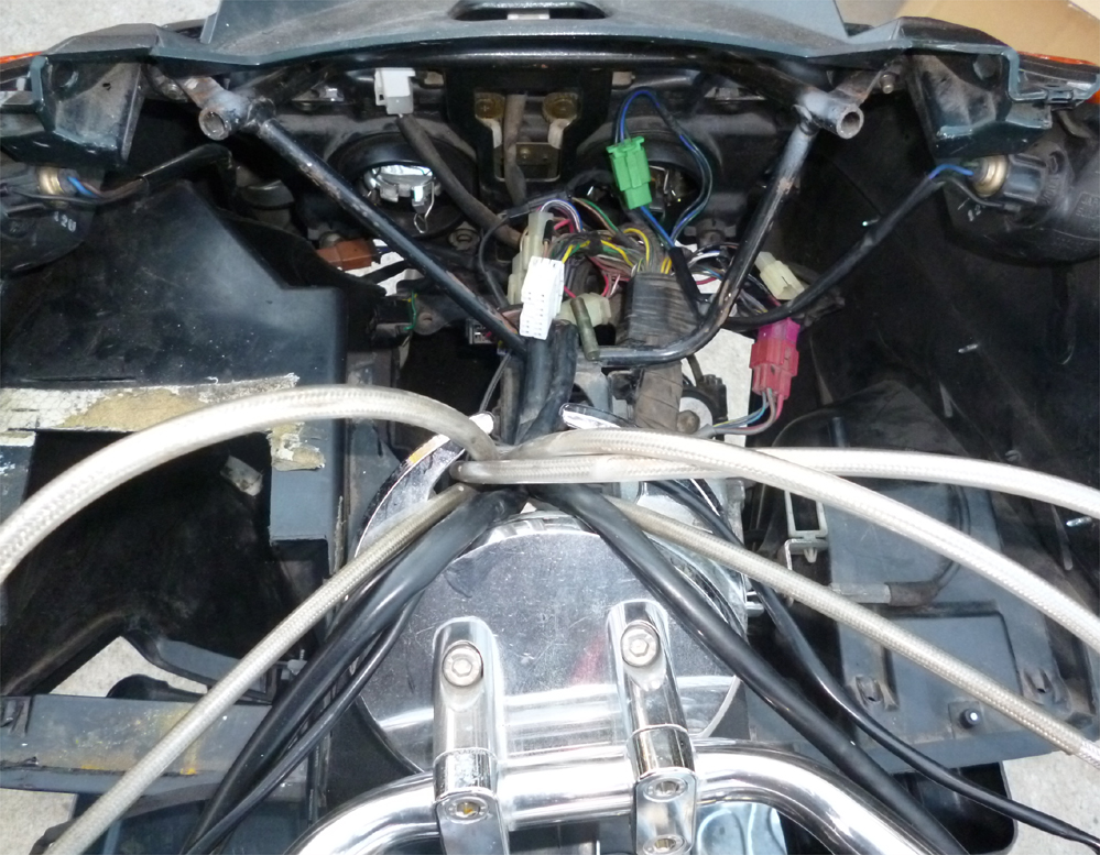 フロントカウルとメーターパネル外して、配線処理します。