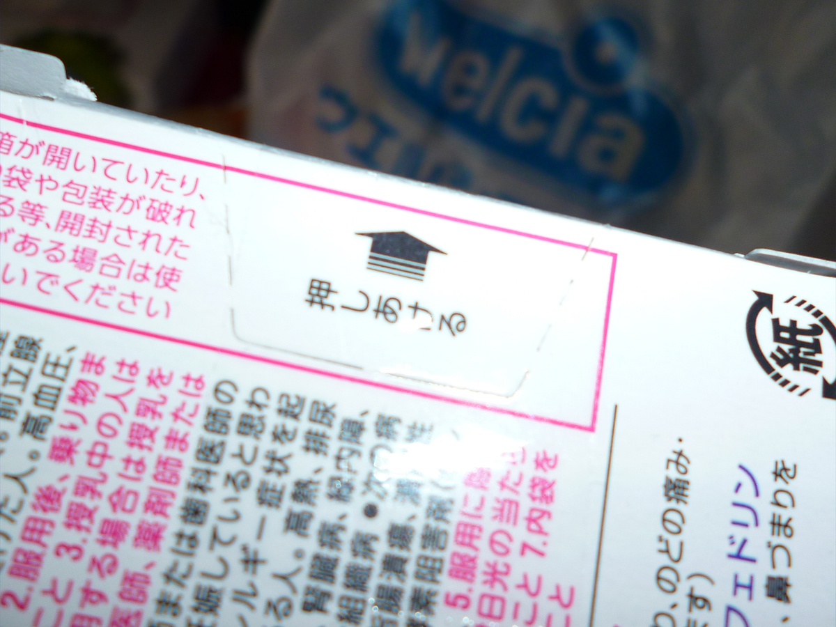 盗難装置のタグを固定する透明テープが、箱の「押しあける」場所に