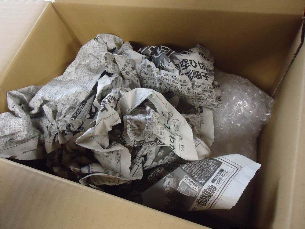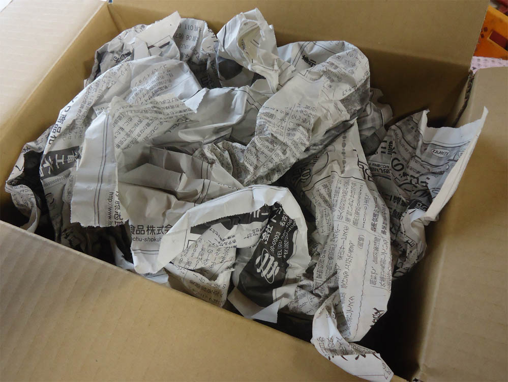 新聞紙等丸めた衝撃材置いて