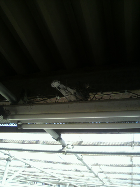 鳩が「バサァ~」と飛んできて、頭上の蛍光灯の上に着地。