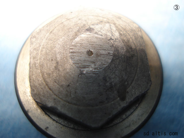 ふと、外したドレンボルトのウチ一個だけ「固形物が付着」してるの発見。